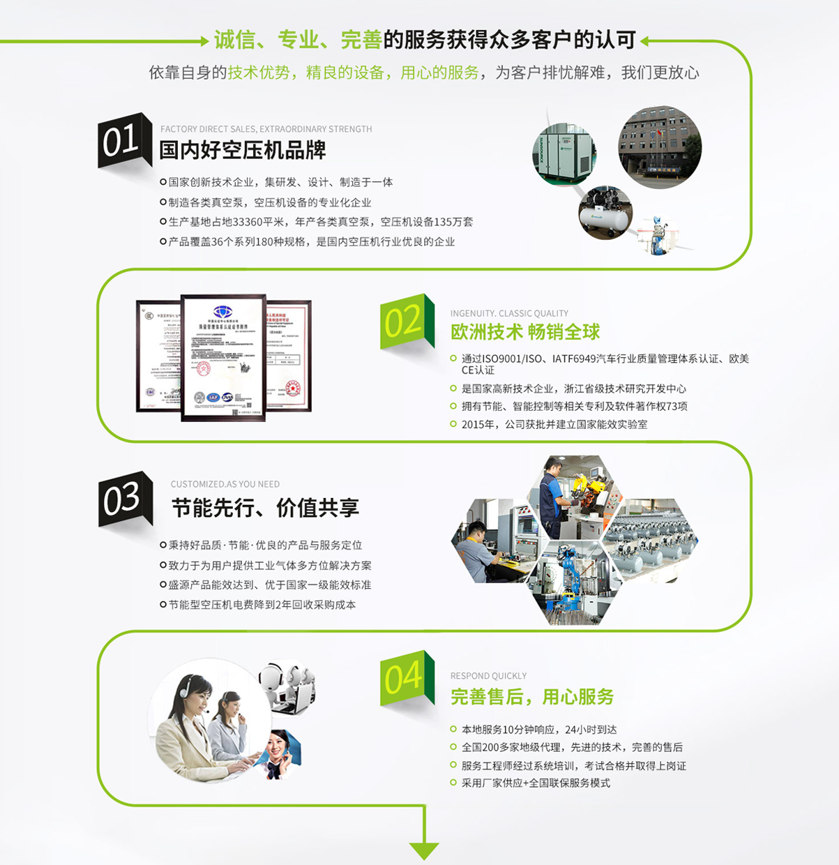 浙江盛源空壓機制造有限公司是一家研究制造無油真空泵系列、新能源電動空壓機、空氣壓縮機設備、器材、永磁伺服電機、工業投資等多元化經營的大型企業,是國家高新技術企業,浙江省級技術研究開發中心。
